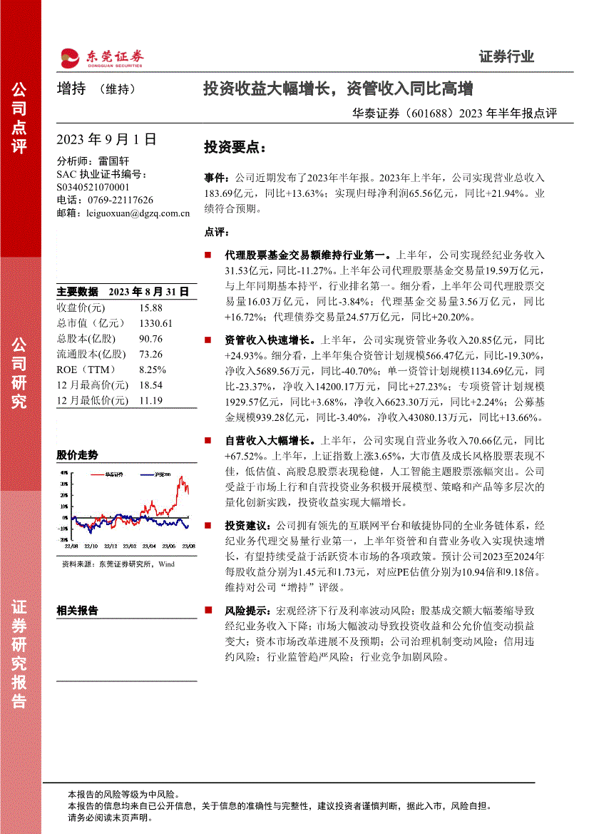 证券行业增持(维持)投资收益大幅增长,资管收入同比高增华泰证券(601688)2023年半年报点评2023年9月1日分析师:雷国轩SAC执业证书编号:S01电线总市值(亿元) 1330.61总股本(亿股) 90.76流通股本(亿股) 73.26ROE(TTM) 8.25%12月最高价(元) 18.5412月最低价(元) 11.19股价走势资料来源:东莞证券研究所,Wind相关报告投资要点:事件:公司近期发布了2023年半年报。
