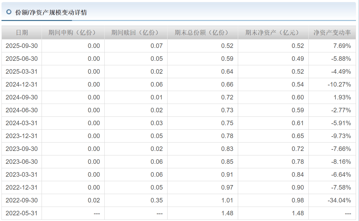 以该基金A类为例,追溯此前的数据可以发现,在该基金成立之初的8个完整季度,收益均为负数;年度收益来看,2023年、2024年同样为负数,2024年净值增长率更是落后同期业绩比较基准超15%。而长期跑输基准直接导致了投资者用脚投票,截至2023年末其A类份额资产净值较成立之初已下滑超50%;2024年末,较比2023年末再度下滑约16.92%。即便是2025年业绩回暖,也无法有效留住投资者,直至目前的规模逼近清盘线。
